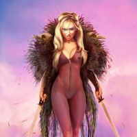 blonde hair, is wearing a bikini-like bodysuit with a feathered cape, and is equipped with sword-like weapons. The background suggests an epic or mystical setting, possibly a fantasy or sci-fi environment given the color scheme and the character's attire.