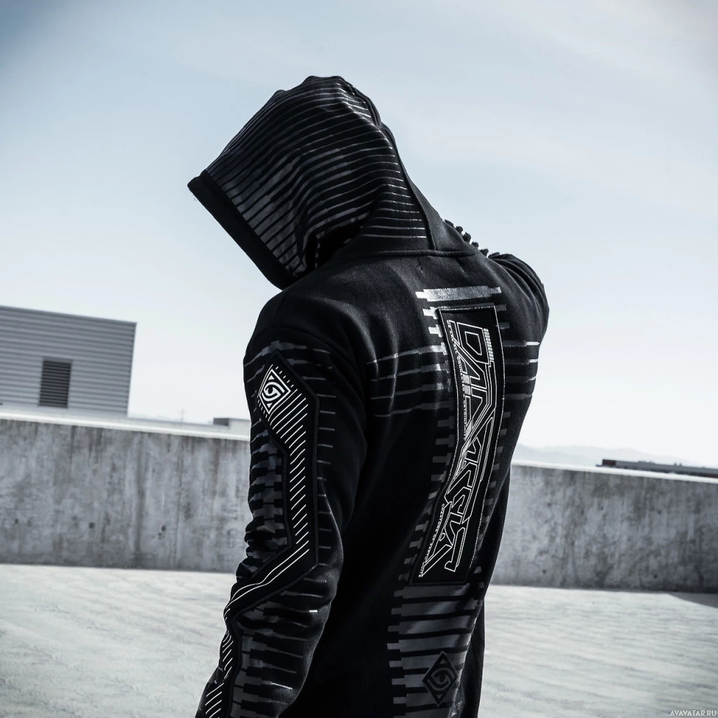 Картинка показывает вид на спину человека в куртке с капюшоном. Капюшон черный с уникальным или современным дизайном, возможно, с геометрическими узорами или формами на спине. Стиль куртки предполагает, что ее можно использовать для таких видов деятельности, как езда на велосипеде или бег из-за ее спортивного и функционального внешнего вида.