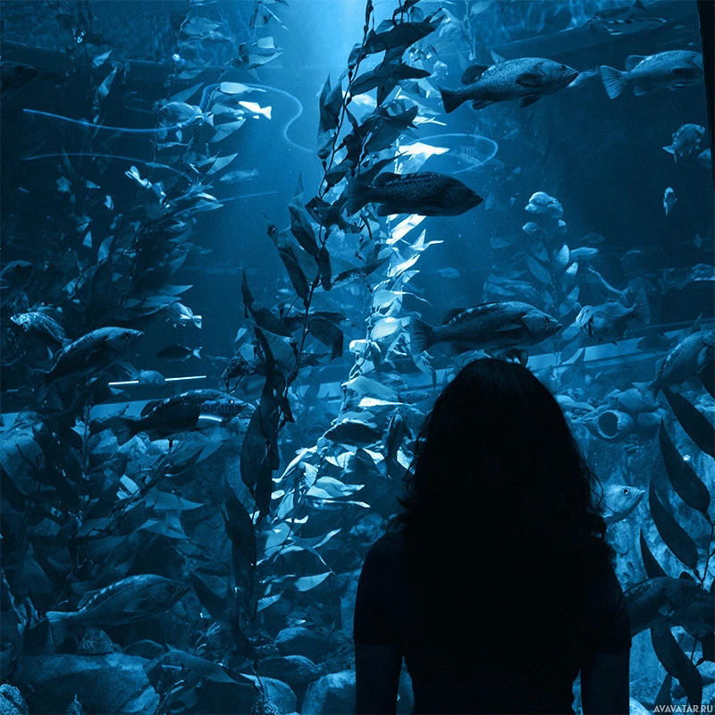 blue hue, emphasizing the depth and the marine environment within the tank. The woman is dressed in