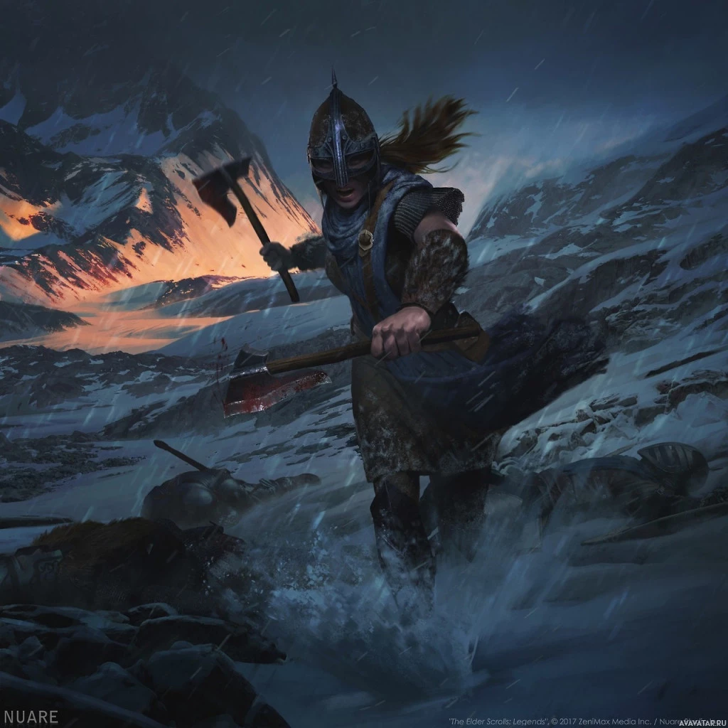 a female warrior in a dramatic, possibly fantasy setting. She is holding an axe and appears to be running or moving quickly through
