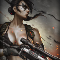 a sniper rifle, which is characteristic of her role in the game. The artwork has a dramatic and intense feel to it, with splashes of red and orange highlighting the action elements around her.