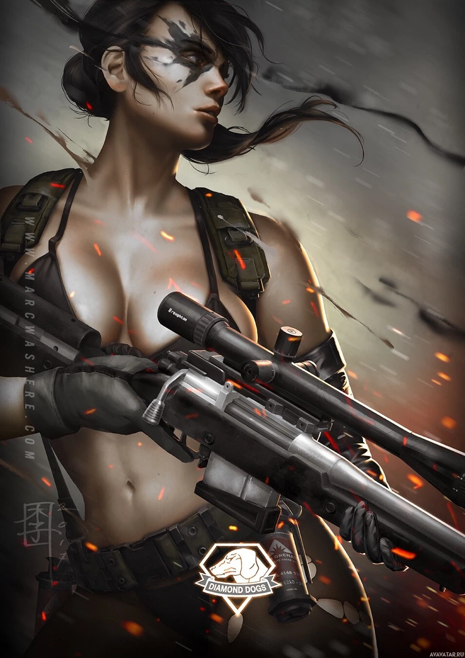 the video game "Metal Gear Solid V: The Phantom Pain." She is shown holding