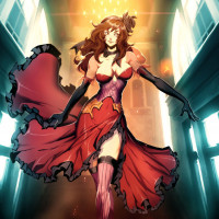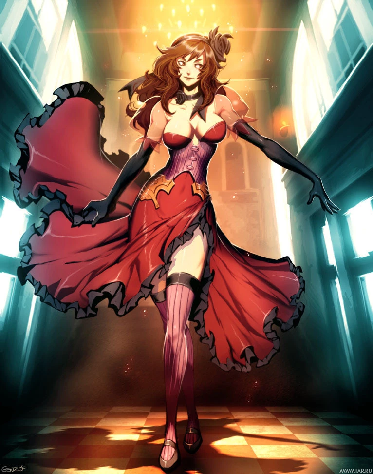 red dress with black accents, paired with thigh-high boots. She appears to be dancing or performing in a dimly