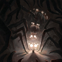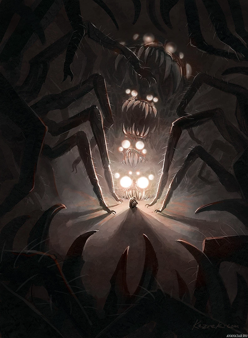a giant spider. The spider is surrounded by smaller creatures that look like insects or arachnids, contributing to