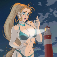 the edge of a cliff or ledge by a lighthouse. The setting seems to be at night with