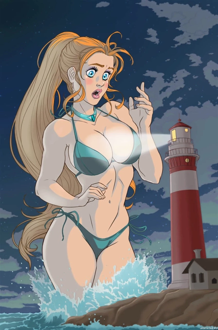 blonde hair tied in pigtails and wearing a blue bikini. Her