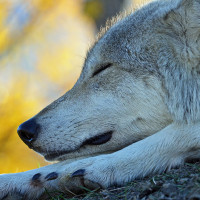 The image shows a wolf resting with its eyes closed, possibly in a dream or sleep. The surrounding environment suggests it could be during autumn given the yellowish-green leaves visible in the background, which may indicate it's a seasonal change.