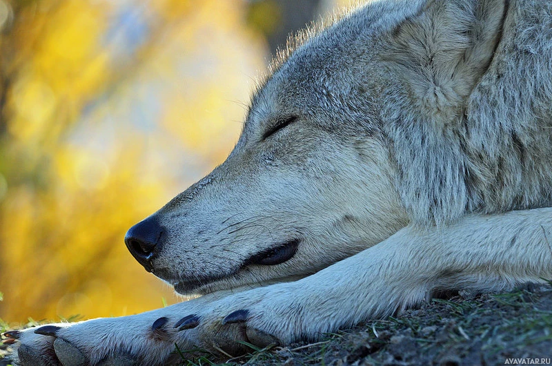 На картинке волк отдыхает с закрытыми глазами, возможно, во сне или сне. Окружающая среда предполагает, что это может быть осенью, учитывая желтовато-зеленые листья, видимые на заднем плане, что может указывать на сезонные изменения.