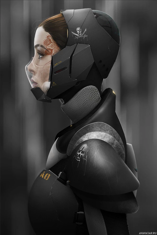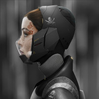 a science fiction theme. Her expression is neutral as she gazes to the side. The overall style of the image aligns with a sci-fi setting.