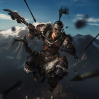 specific character is wearing armor and holding a spear, suggesting he might be engaged in combat or some form of adventure within the game's setting. The background features a mountainous landscape, adding to the epic and