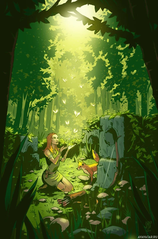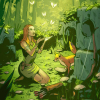 На снимке изображена девушка с рыжими волосами, которая оказывается в лесу. Она стоит на коленях рядом с лисой на земле. Кажется, они оба смотрят на что-то вместе. На заднем плане есть отверстие в деревьях, которое пропускает солнечный свет, освещая сцену теплым светом. Также вокруг летают маленькие бабочки.