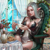 a cup of tea, suggesting a relaxed or leisurely moment. There's also a plate on the table with what might be cookies. The character is dressed in attire that looks elegant yet fantasy-inspired, possibly hinting at her magical nature or status within