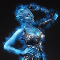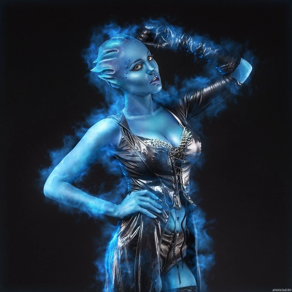 The image shows a character with blue skin and an aquatic appearance, possibly inspired by