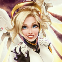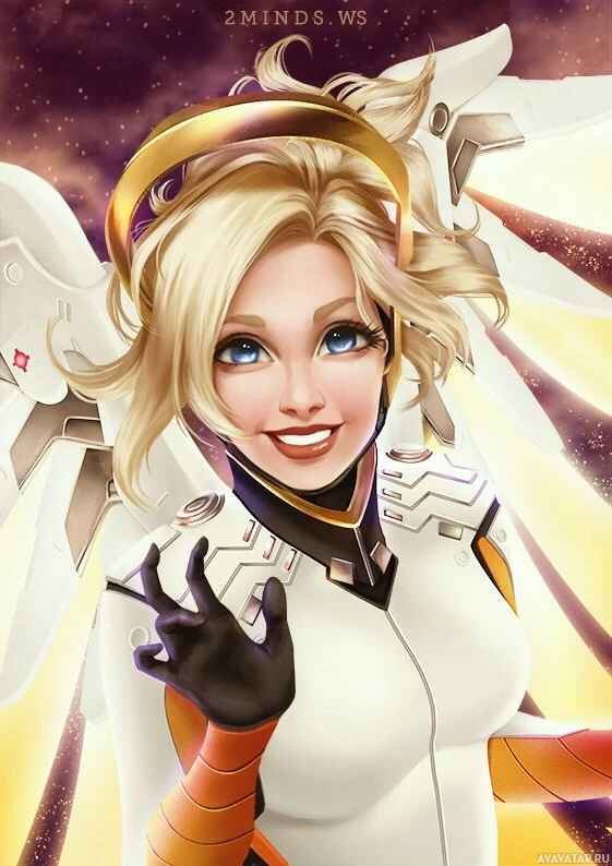 The image depicts an animated character that appears to be Mercy, a character from