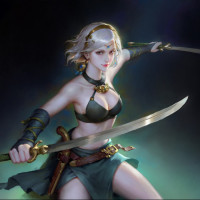 The image features a female character with white hair, wearing a fantasy-style outfit that includes a skirt and armor. She is wielding two swords crossed in front of her body. It appears to be an illustration or digital artwork rather than a photograph.