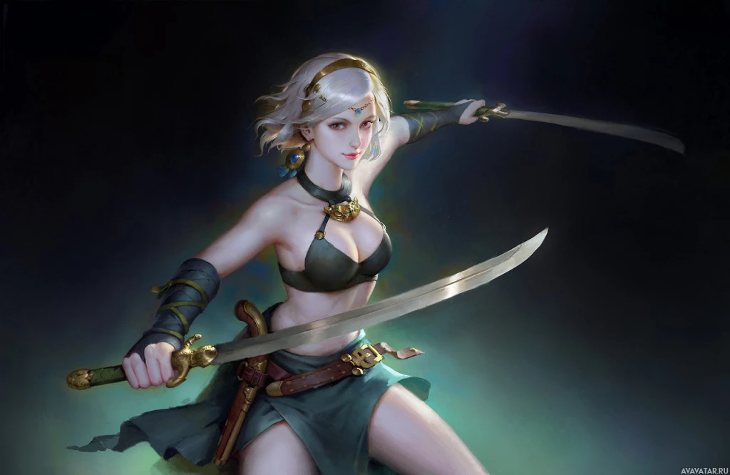 На картинке изображен женский персонаж с белыми волосами, одетый в наряд в стиле фэнтези, который включает в себя юбку и доспехи. Она держит перед своим телом два меча. Это скорее иллюстрация или цифровое произведение искусства, чем фотография.