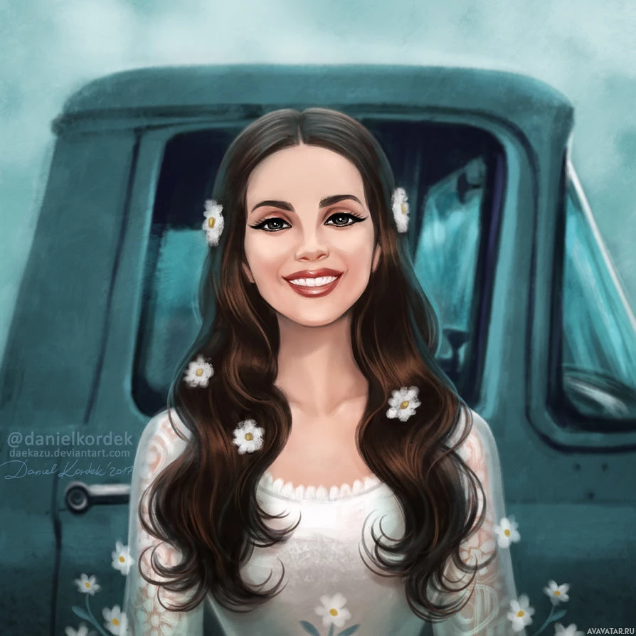 white flowers adorning her hair, adding to the festive or celebratory theme of the image. In the background, there's an old-fashioned truck, which contrasts with