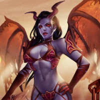 Queen of Pain from the game Dota 2. She is portrayed with devil-like horns and wings, wearing red and black armor, which adds to her demonic appearance. The background suggests a fiery or hellish environment, fitting her name and role as