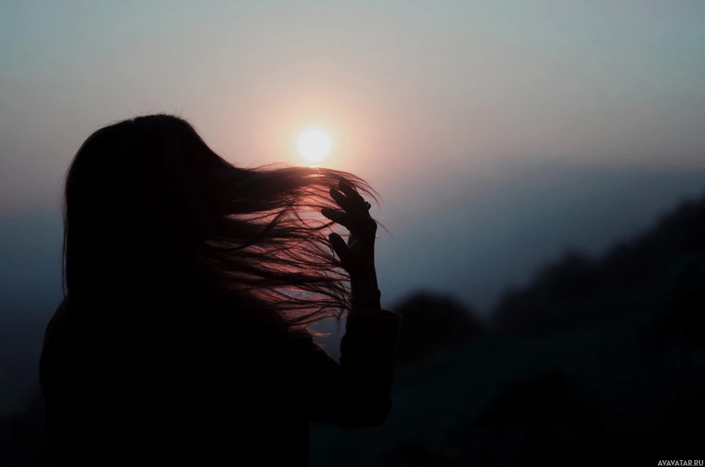 a sense of motion and serenity in the scene, as the person's hair is caught mid-wave by the breeze. The sun is low on the horizon, which creates a dramatic light effect that contrasts with