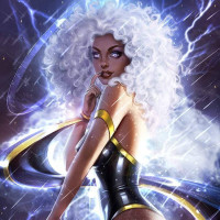 mutant abilities, which often involve controlling weather patterns. In this artwork, she appears to be harnessing electricity or lightning, which is a signature element of her character's powers. The background gives off a cosmic or otherworldly feel, fitting for