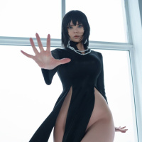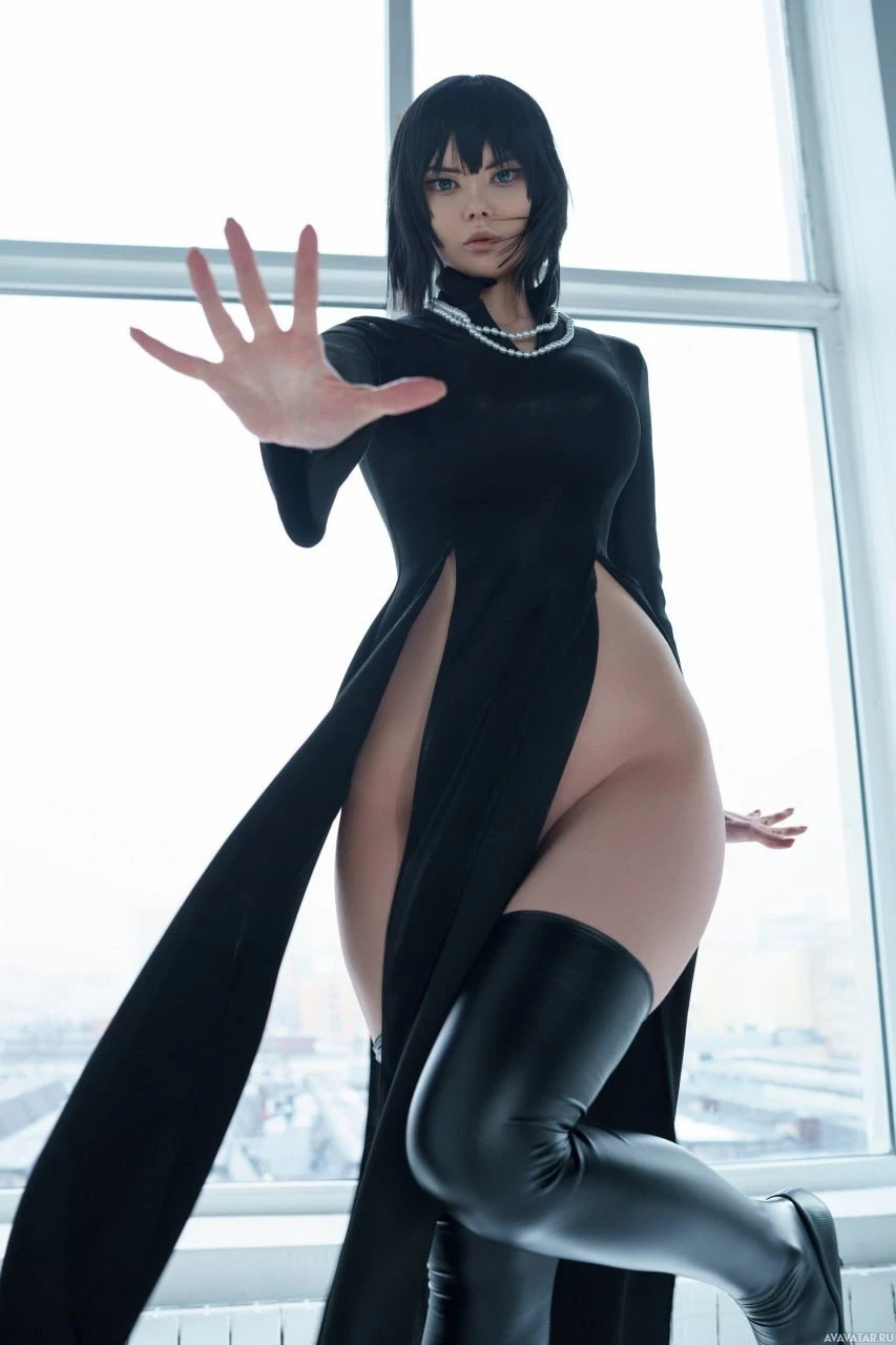 In the image, there is a woman who appears to be wearing cosplay. She has
