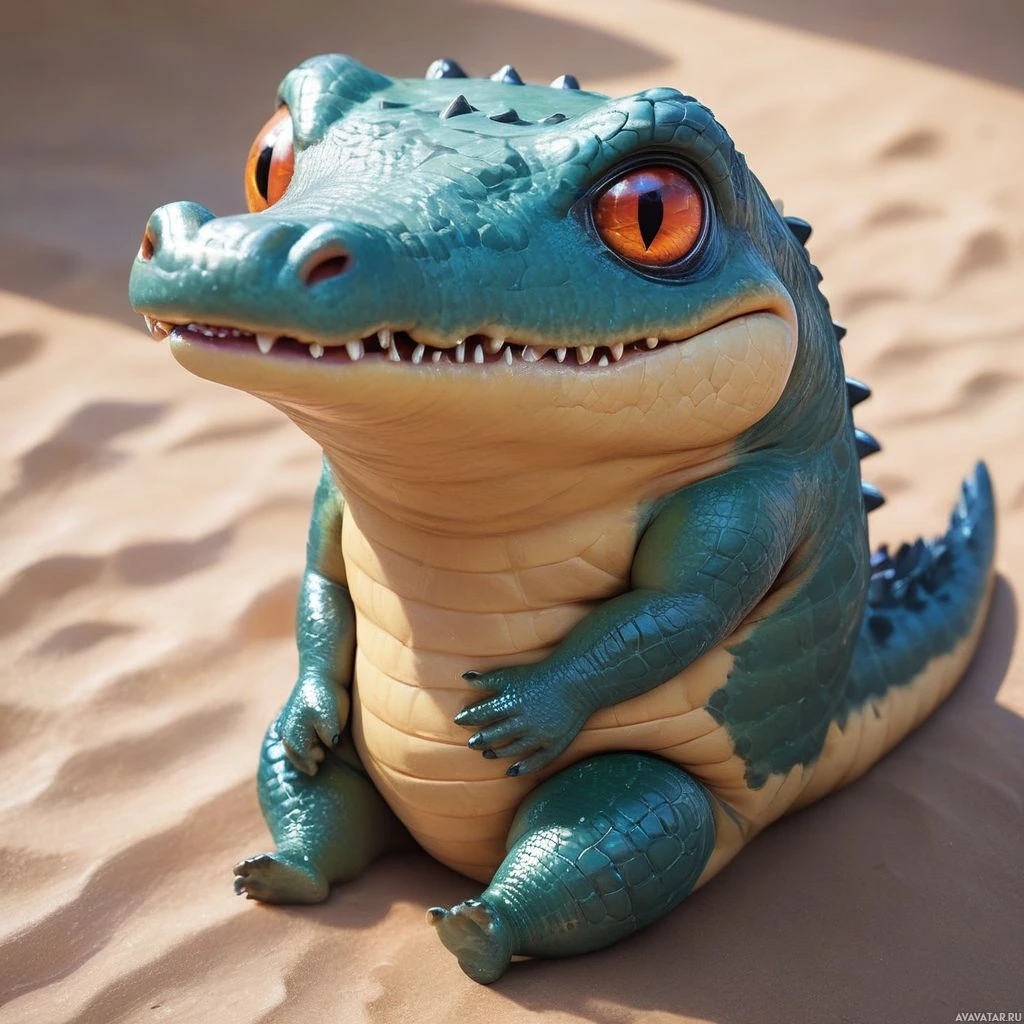 large eyes and a cartoonish style. The crocodile is depicted in a sitting position on what appears to be sand, possibly simulating the animal's