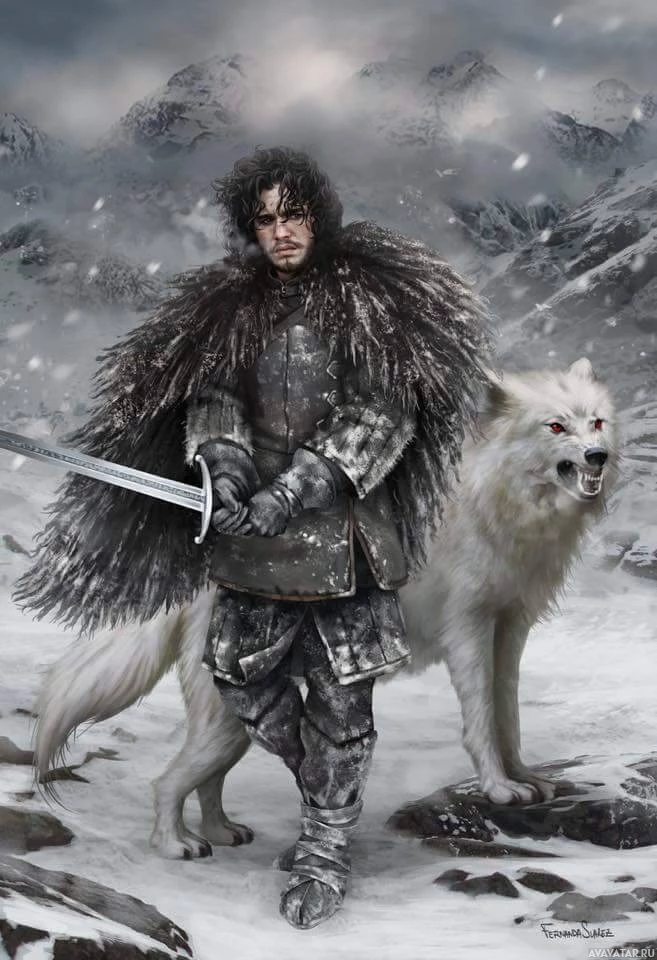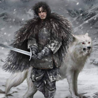 a winter cloak and is holding a sword. Accompanying him is a direwolf, a creature associated with the character's family, the Starks. They are both situated against a backdrop that includes snow-
