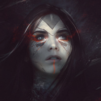 red highlights on her cheeks, which could suggest a supernatural or fantastical element to the image. The background is monochromatic and seems to be composed of