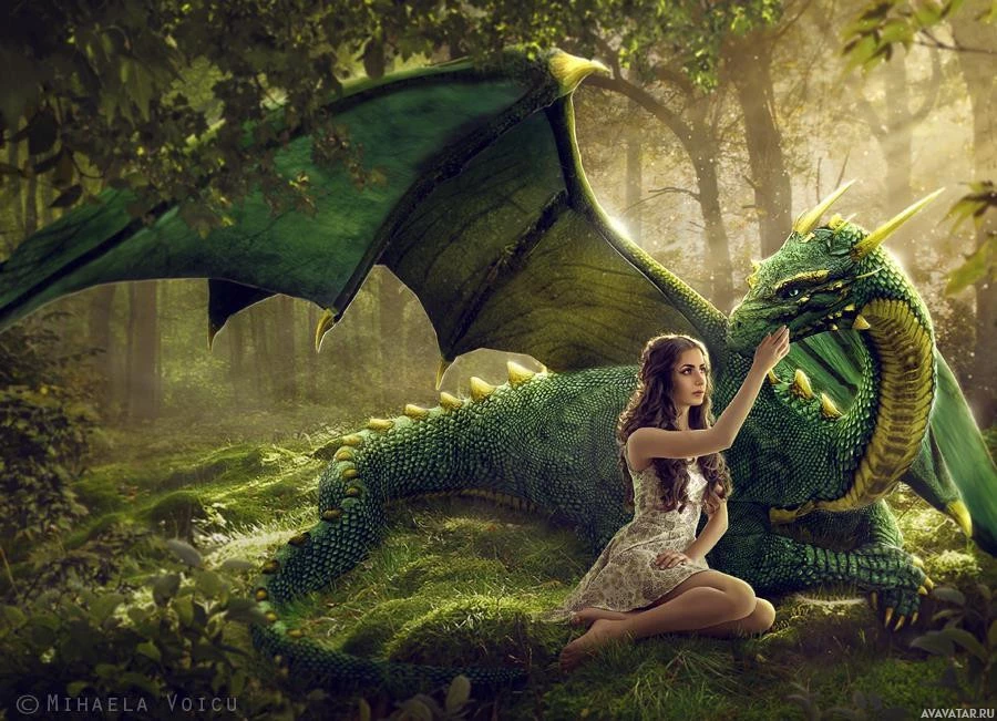 lush vegetation and misty atmospheric conditions. Both the girl and the dragon are looking towards each other, suggesting