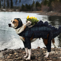 The image features a dog dressed up as a dinosaur. The dog is wearing a costume that resembles a Tyrannosaurus Rex, complete with a headpiece and