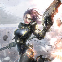 На картинке изображен женский персонаж, часто называемый «надзорной» или «геймерской девушкой», одетый в футуристическую броню. Она держит то, что кажется оружием, и имеет решительное выражение лица. Фон предполагает хаотичную сцену битвы со взрывами и обломками, летящими вокруг нее.