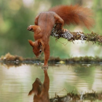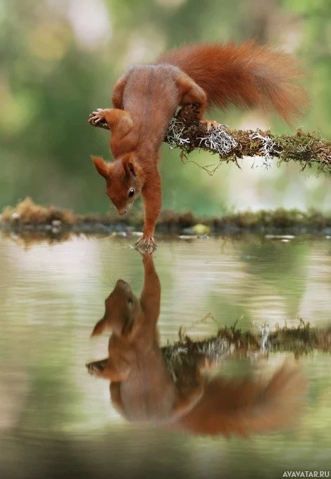 a body of water, possibly a pond or a stream. It appears to be looking at its reflection in the water, which creates