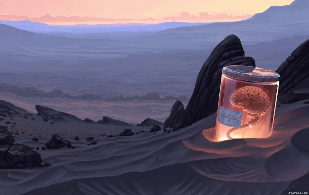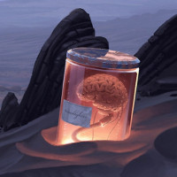 a science fiction or fantasy scene. A large, preserved brain is inside a jar that's placed on