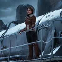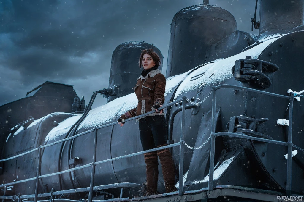 a steam locomotive, suggesting they might be on a mission or preparing to board the train. The setting looks cold and wintry, fitting with the historical context of the game's period.