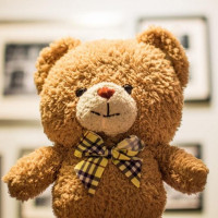 На снимке изображен плюшевый медведь в клетчатом галстуке. Похоже, что он сидит перед обрамленными изображениями на стене, что предполагает, что он может быть частью коллекции или настройки дисплея. Фон нейтральный и не отвлекает от предмета.