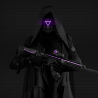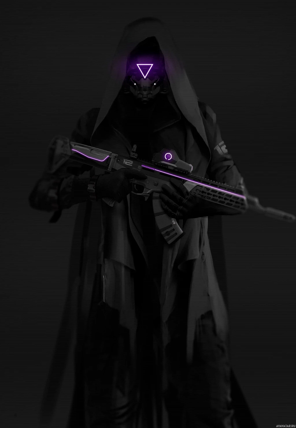 video game "Apex Legends," specifically Wraith, who is known for her hooded appearance and use of a gun with a purple energy effect. She is holding the weapon in a ready stance and wearing