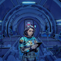 The image features a female character wearing what appears to be futuristic or space exploration gear. She is inside what looks like the control room of a spacecraft, with various screens and controls visible around her. The setting suggests a science fiction theme.