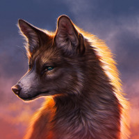 The image depicts a wolf. It is illustrated in a realistic style, with attention to detail on the fur and features of the animal. The background appears to be a cloudy sky with warm colors, possibly suggesting either dawn or dusk due to the lighting.