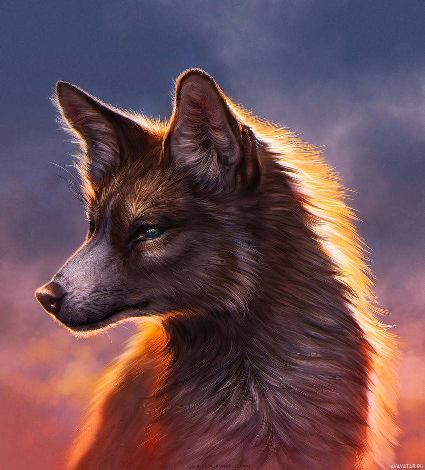 На картинке изображен волк. Иллюстрация выполнена в реалистичном стиле, с вниманием к деталям меха и чертам животного. На заднем плане изображено облачное небо теплых тонов, что, возможно, из-за освещения наводит на мысль о рассвете или сумерках.