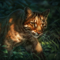distinctive markings on its fur, which are characteristic of the species. It seems to be in motion, possibly exploring or moving towards something off-camera. There is