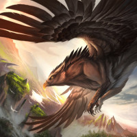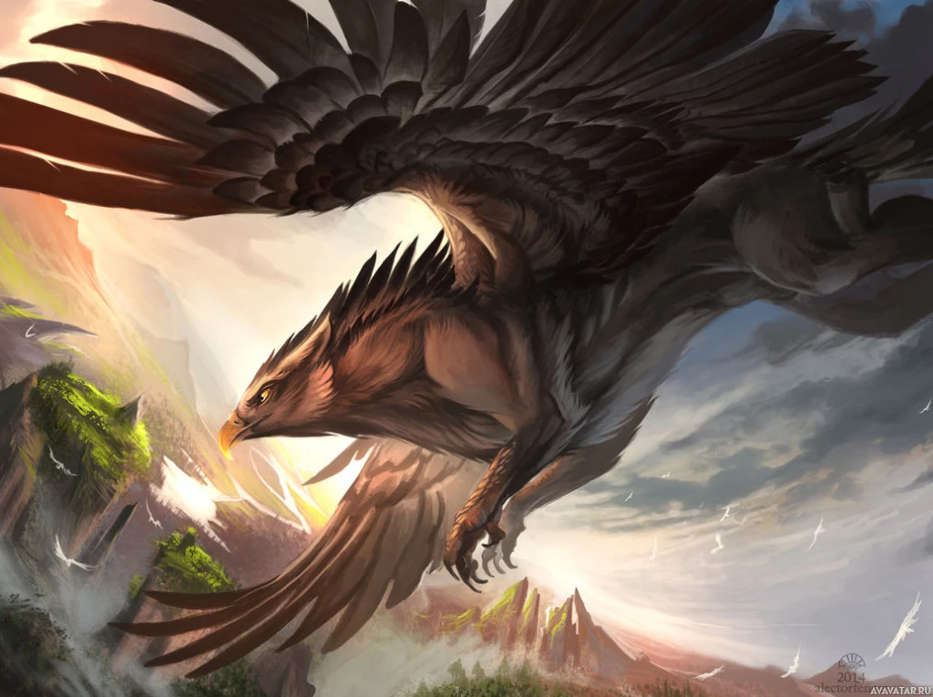 a mythical creature that resembles a lion with the body of an eagle. It is often associated with fantasy or mythology. The griffon is shown in mid-flight, with its wings spread wide and its head turned as if looking towards the viewer. The background features