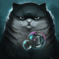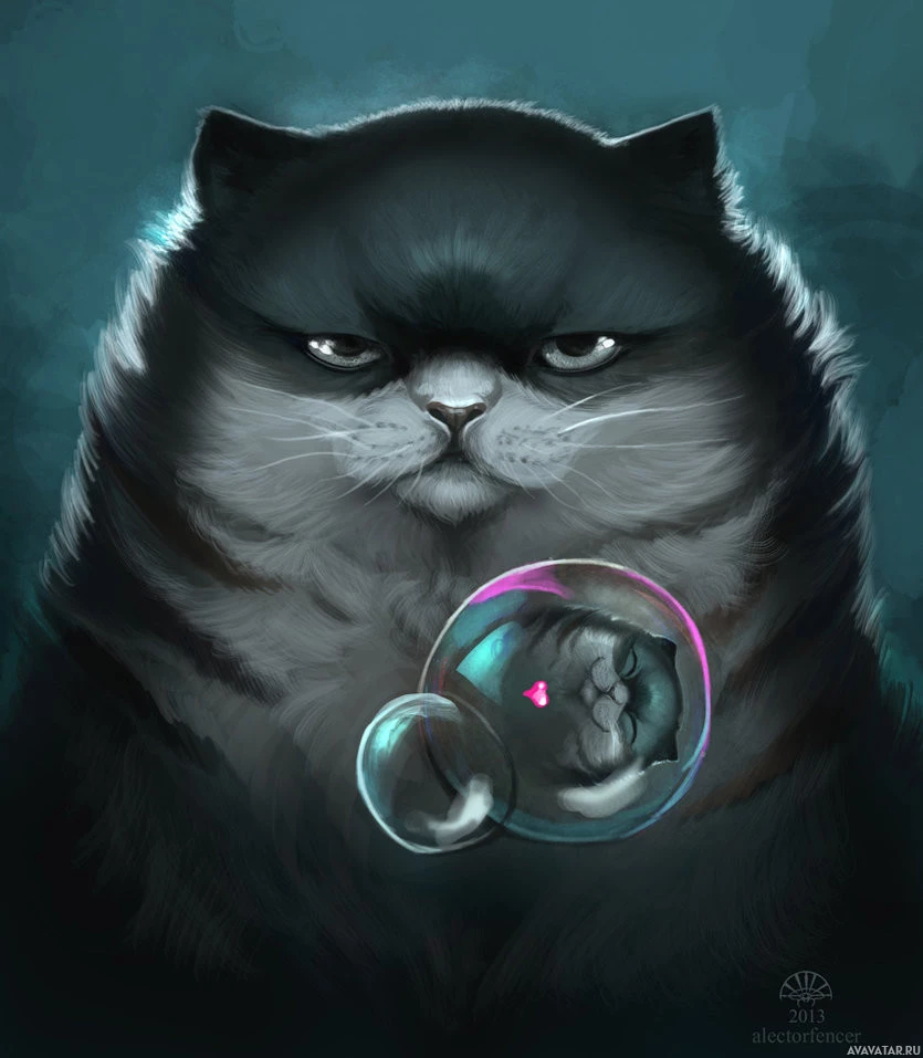 a dark coat and distinct markings on its face. In its lap, there is a bubble containing a smaller cat-like creature, which seems to be observing the world around it. The overall atmosphere of the illustration is whimsical and surreal, as it depicts