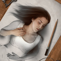 closed eyes, depicted in a relaxed state that suggests she might be sleeping or resting. She is laying down on what appears to be