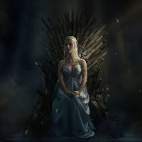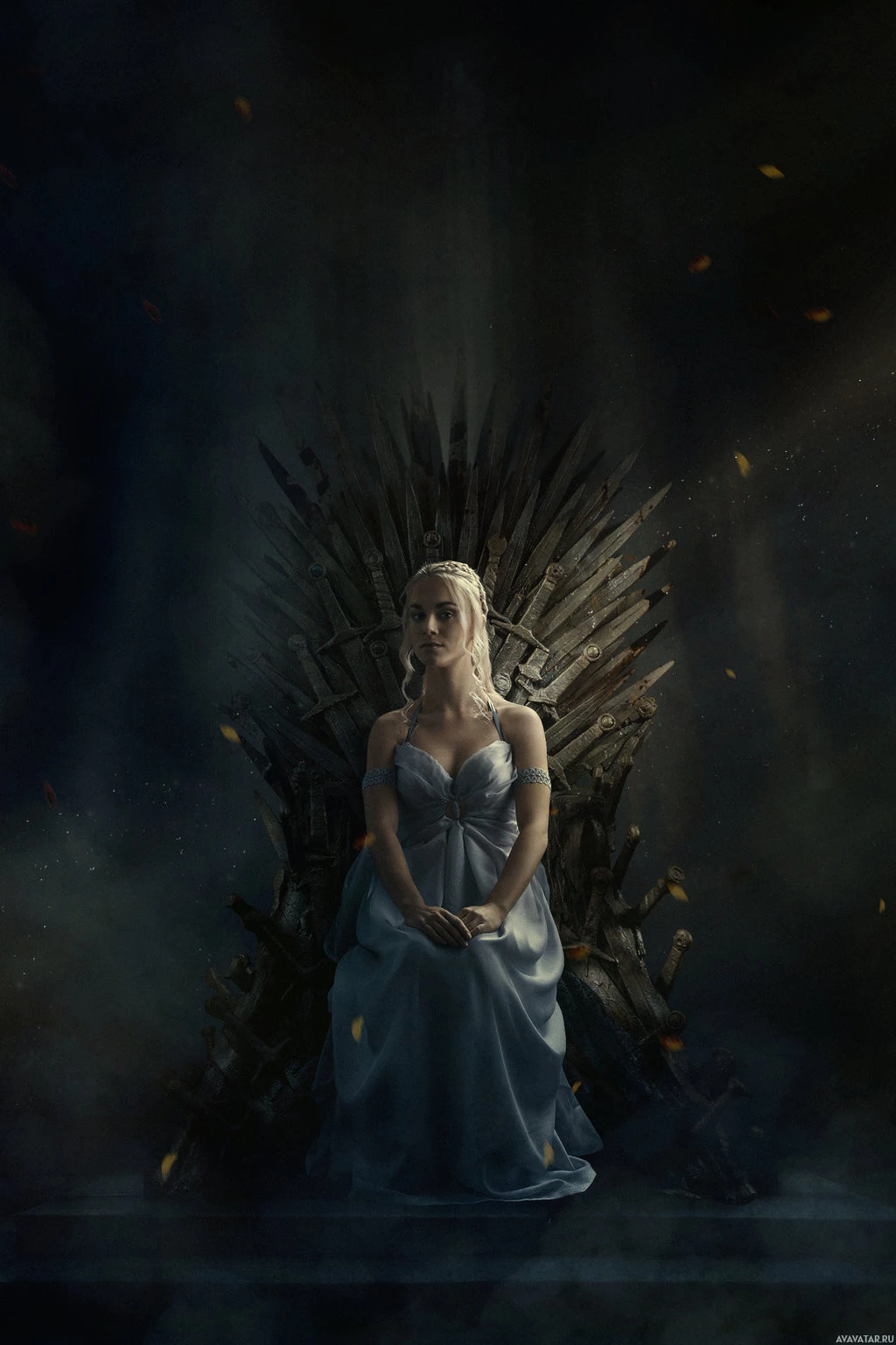 a white dress that resembles her queenly attire in the series. The throne has fallen and is surrounded by what appears to be debris or destruction, suggesting a scene from a battle or
