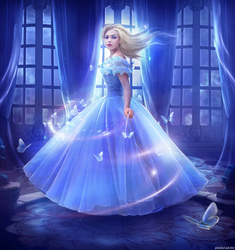 a young woman dressed in a blue, princess-style dress. She has