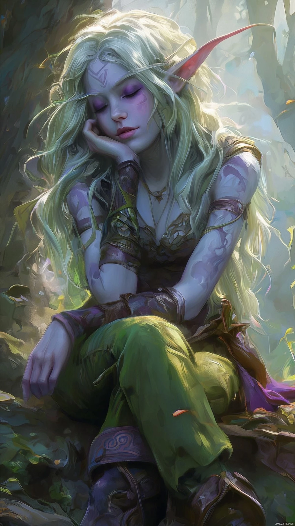 a fantasy character that appears to be an elf. She is sitting in what looks like a forest or jungle setting, surrounded by green foliage and