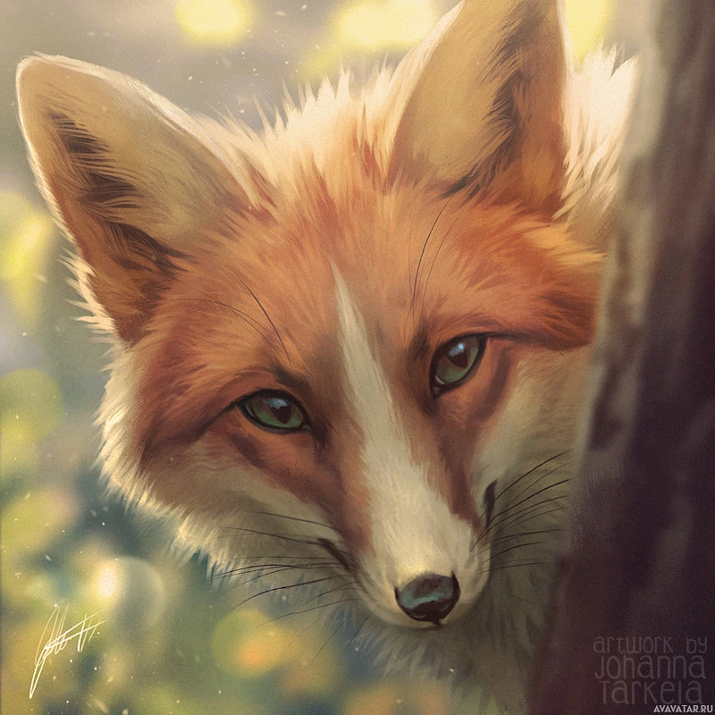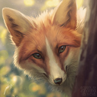 The image features a close-up of a fox's head, showing its alert eyes and fur. It appears to be in a natural setting with greenery around it. The art style is detailed and illustrative, capturing the texture and expression of the animal.