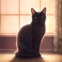 На картинке изображена черная кошка, сидящая на полу, с окном на заднем плане. Кошка смотрит прямо на зрителя, и ее взгляд производит впечатление бдительности или любопытства. Освещение предполагает, что это может быть рано утром или поздно днем, так как солнечный свет мягко освещает комнату и кошку.