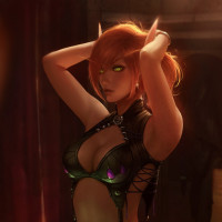 battle gear, and there's a blurry reflection of her in the background, suggesting she might be looking at herself in a mirror. The setting appears to be indoors, possibly in a room with a dimly