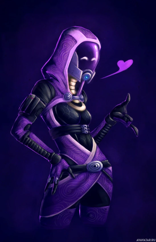 the video game "Mass Effect." She is depicted in her signature purple armor, which includes a helmet with visors and a body suit adorned with